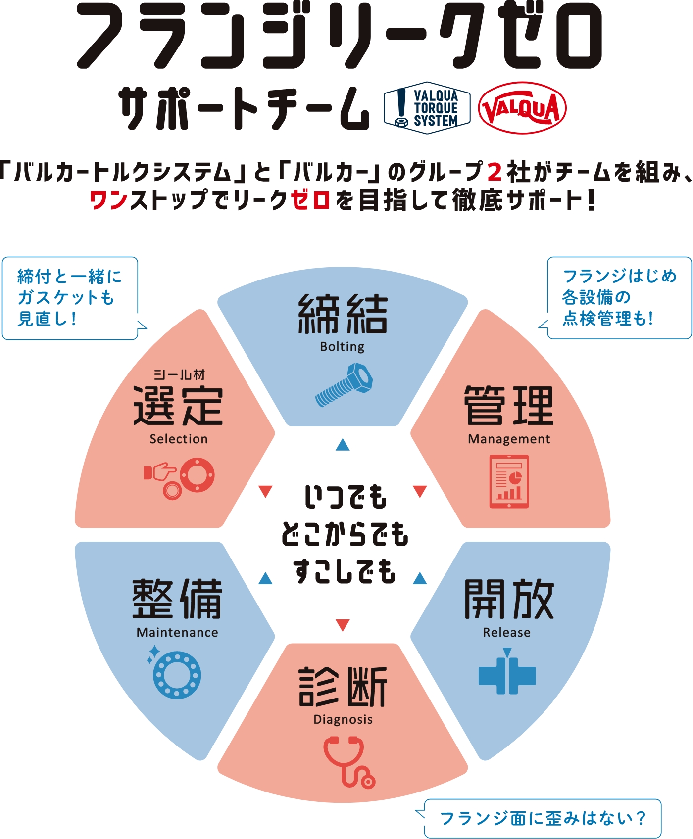 フランジとフランジの間に挟みこむことで気密性・液密性を持たせる固定用シールをガスケットと呼びます。その性能を最大限発揮させるためには適切な力でフランジボルトの締付を行う必要があります。そのガスケットなどのシール材メーカー大手である株式会社バルカーと、フランジ締付に関して豊富な経験を持つ当社がタッグを組みました。当社からは目的に応じた締付ツールの選定とフランジボルト締付・ゆるめに関するあらゆるノウハウを、お客さまへの同行や、勉強会の開催などを通じて提供しています。またフランジあたり面に対するフェーサー加工など、現地に出向いて行う加工工事なども可能です。それに加え今まで当社では対応できなかった適切なガスケットの選定・提供、プラント工事に関わる定期点検や工程管理のDX化などが、バルカー社の協力により実現可能となり、フランジ締付に関する課題解決をワンストップで行うことが可能となりました。バルカー社の体験型シール施工研修センター「STCセンター」で、当社の各種ツールが常備されており、実地型の研修や製品・締付のデモが可能です。(写真:センター内の大型フランジ)