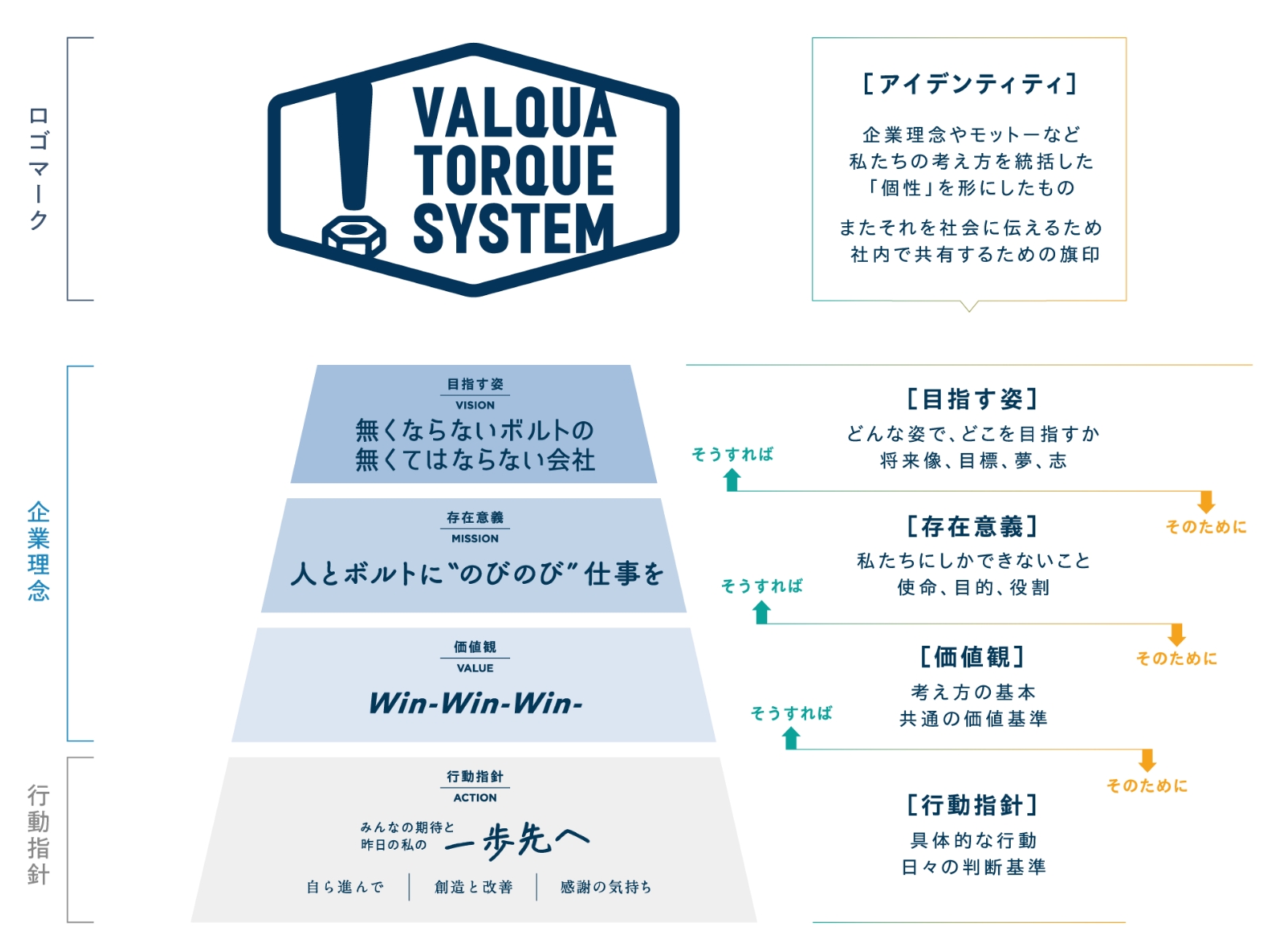 創業時からのDNAはそのままに、より社内に、そして現代社会にフィットする形に、MVV(ミッション・ビジョン・バリュー)」の枠組みを用いて企業理念のアップデートを行いました。すべては「無くならないボルトの無くてはならない会社」になるため、それが当社が社会で成せる一番の貢献であるためです。